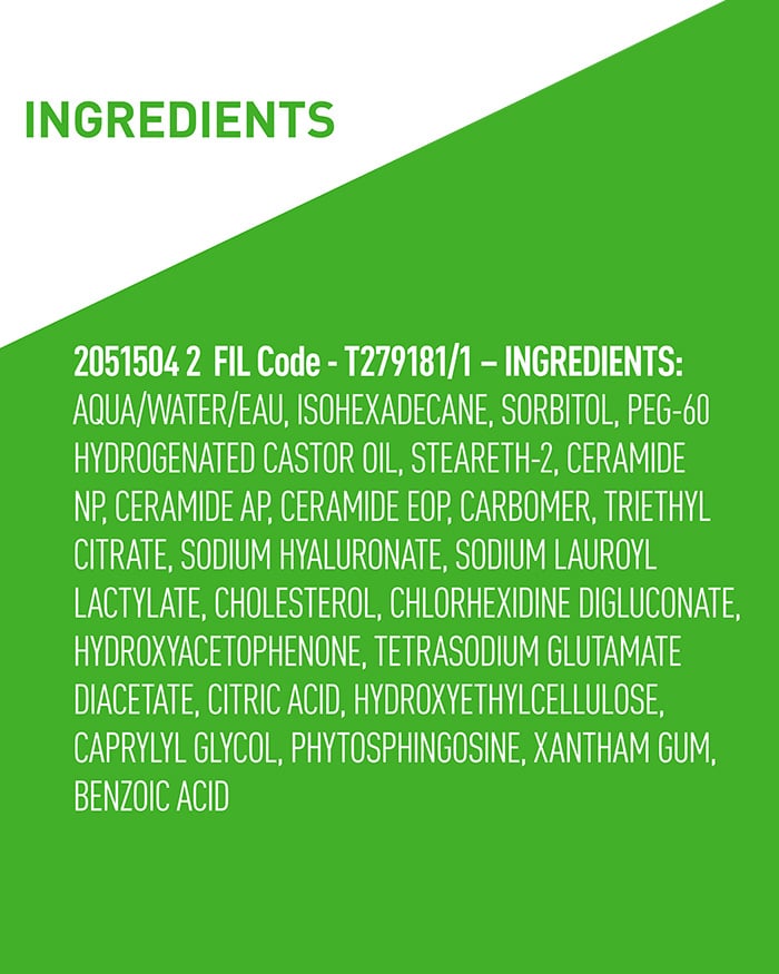 2051504 2 FIL Code – T279181/1 – INGREDIENTS: AQUA/WATER/EAU, ISOHEXADECANE, SORBITOL, PEG-60 HYDROGENATED CASTOR OIL, STEARETH-2, CERAMIDE NP, CERAMIDE AP, CERAMIDE EOP, CARBOMER, TRIETHYL CITRATE, SODIUM HYALURONATE, SODIUM LAUROYL LACTYLATE, CHOLESTEROL, CHLORHEXIDINE DIGLUCONATE, HYDROXYACETOPHENONE, TETRASODIUM GLUTAMATE DIACETATE, CITRIC ACID, HYDROXYETHYLCELLULOSE, CAPRYLYL GLYCOL, PHYTOSPHINGOSINE, XANTHAM GUM, BENZOIC ACID