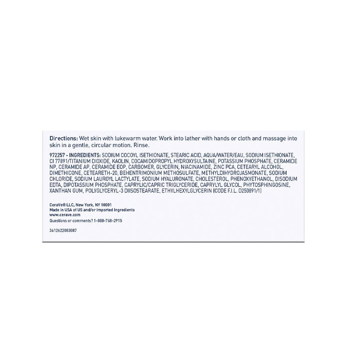 Sodium Cocoyl Isethionate, Stearic Acid, Aqua / Water / Eau, Sodium Isethionate, Ci 77891 / Titanium Dioxide, Kaolin, Cocamidopropyl Hydroxysultaine, Potassium Phosphate, Ceramide Np, Ceramide Ap, Ceramide Eop, Carbomer, Glycerin, Niacinamide, Zinc Pca, Cetearyl Alcohol, Dimethicone, Ceteareth-20, Behentrimonium Methosulfate, Methyldihydrojasmonate, Sodium Chloride, Sodium Lauroyl Lactylate, Sodium Hyaluronate, Cholesterol, Phenoxyethanol, Disodium Edta, Dipotassium Phosphate, Caprylic/Capric Triglyceride, Caprylyl Glycol, Phytosphingosine, Xanthan Gum, Polyglyceryl-3 Diisostearate, Ethylhexylglycerin