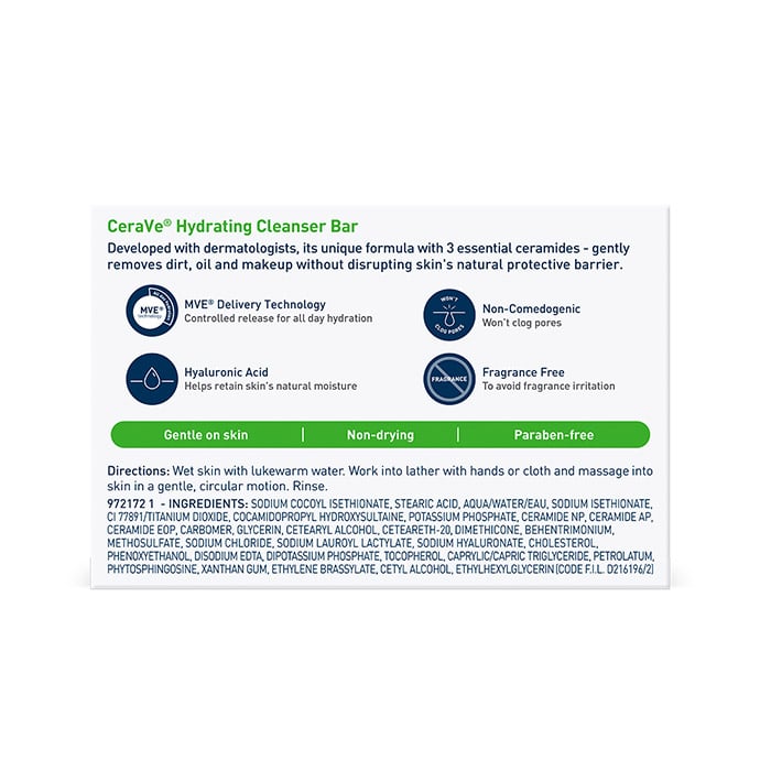 Suitable for normal to dry skin, the CeraVe Hydrating Cleanser Bar was developed with dermatologists to effectively remove dirt, oil and makeup without disrupting the natural skin barrier.
