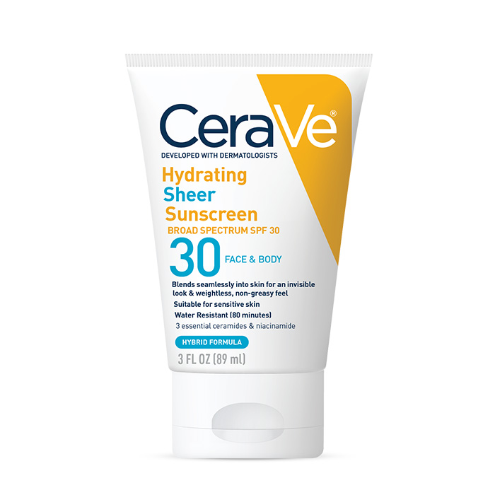 Developed with dermatologists, CeraVe Hydrating Sheer Sunscreen Broad Spectrum SPF 30 combines mineral and chemical sun filters to help effectively reflect and absorb the sun’s damaging rays.