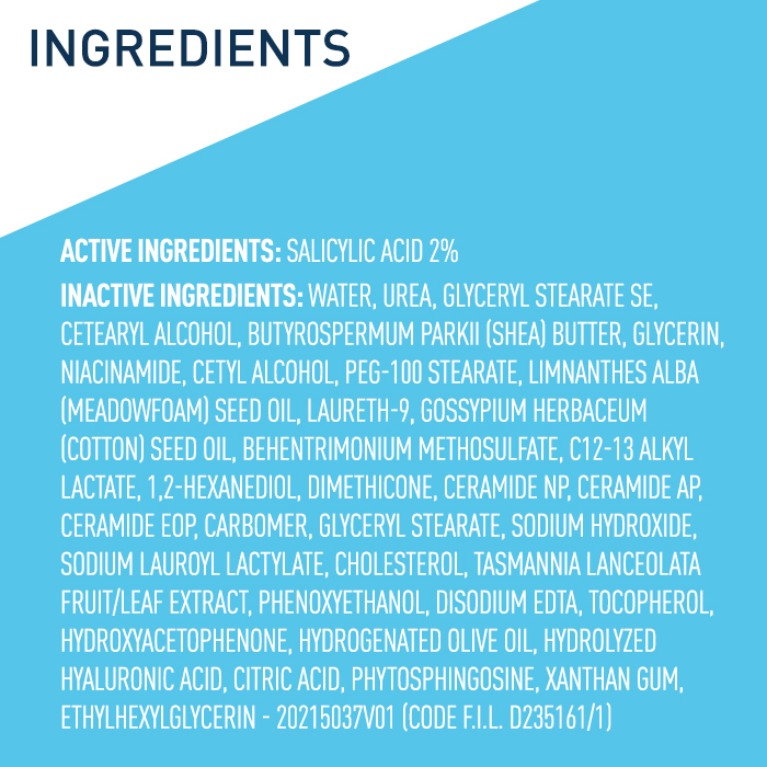 INACTIVE INGREDIENTS: WATER, UREA, GLYCERYL STEARATE SE, CETEARYL ALCOHOL, BUTYROSPERMUM PARKII (SHEA) BUTTER, GLYCERIN, NIACINAMIDE, CETYL ALCOHOL, PEG-100 STEARATE, LIMNANTHES ALBA (MEADOWFOAM) SEED OIL, LAURETH-9, GOSSYPIUM HERBACEUM (COTTON) SEED OIL, BEHENTRIMONIUM METHOSULFATE, C12-13 ALKYL LACTATE, 1,2-HEXANEDIOL, DIMETHICONE, CERAMIDE NP, CERAMIDE AP, CERAMIDE EOP, CARBOMER, GLYCERYL STEARATE, SODIUM HYDROXIDE, SODIUM LAUROYL LACTYLATE, CHOLESTEROL, TASMANNIA LANCEOLATA FRUIT/LEAF EXTRACT, PHENOXYETHANOL, DISODIUM EDTA, TOCOPHEROL, HYDROXYACETOPHENONE, HYDROGENATED OLIVE OIL, HYDROLYZED HYALURONIC ACID, CITRIC ACID, PHYTOSPHINGOSINE, XANTHAN GUM, ETHYLHEXYLGLYCERIN
