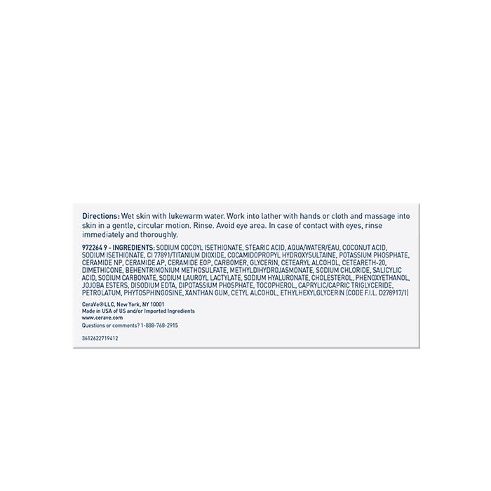 SODIUM COCOYL ISETHIONATE, STEARIC ACID, AQUA / WATER / EAU, COCONUT ACID, SODIUM ISETHIONATE, CI 77891 / TITANIUM DIOXIDE, COCAMIDOPROPYL HYDROXYSULTAINE, POTASSIUM PHOSPHATE, CERAMIDE NP, CERAMIDE AP, CERAMIDE EOP, CARBOMER, GLYCERIN, CETEARYL ALCOHOL, CETEARETH-20, DIMETHICONE, BEHENTRIMONIUM METHOSULFATE, METHYLDIHYDROJASMONATE, SODIUM CHLORIDE, SALICYLIC ACID, SODIUM CARBONATE, SODIUM LAUROYL LACTYLATE, SODIUM HYALURONATE, CHOLESTEROL, PHENOXYETHANOL, JOJOBA ESTERS, DISODIUM EDTA, DIPOTASSIUM PHOSPHATE, TOCOPHEROL, CAPRYLIC/CAPRIC TRIGLYCERIDE, PETROLATUM, PHYTOSPHINGOSINE, XANTHAN GUM, CETYL ALCOHOL, ETHYLHEXYLGLYCERIN