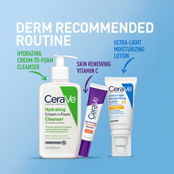 CeraVe Ultra-Light Moisturizing Lotion for normal to oily skin includes broad spectrum SPF 30 sunscreen to help protect skin from sun damage, which can lead to premature signs of aging and skin cancer (when used as directed with other sun protection measures) plus hyaluronic acid and three essential ceramides to hydrate and help restore the skin’s barrier all while leaving a matte finish.