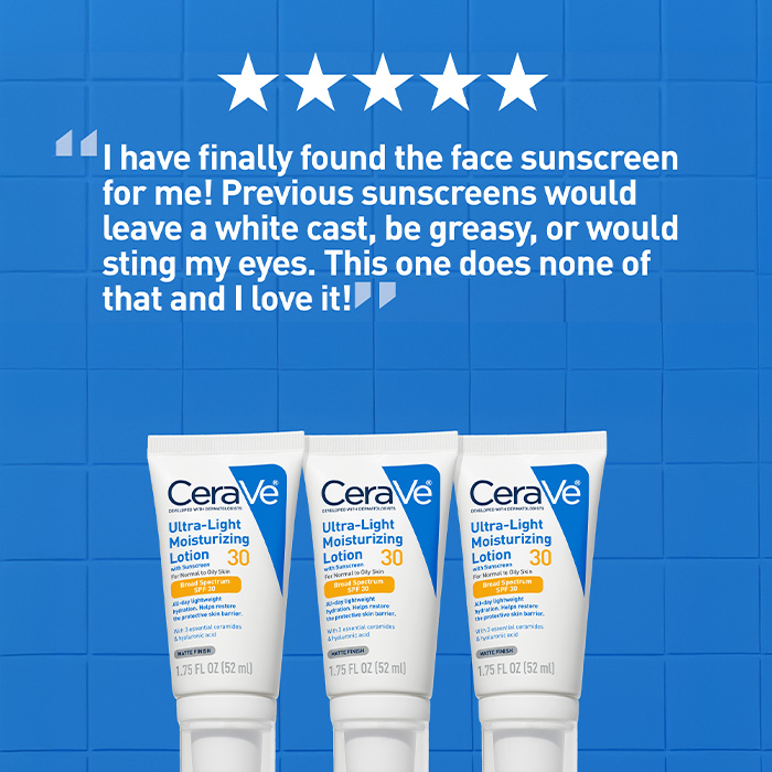 CeraVe Ultra-Light Moisturizing Lotion includes broad spectrum SPF 30 sunscreen to help protect skin from sun damage, which can lead to premature signs of aging and skin cancer (when used as directed with other sun protection measures), plus hyaluronic acid and three essential ceramides to hydrate and help restore the skin’s barrier. Additionally, our lightweight oil-free moisturizer provides a matte finish, won’t clog pores and leaves your skin feeling soft and smooth, as well as protected from the sun.